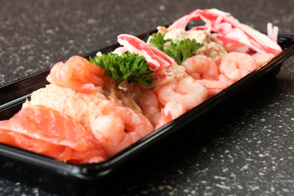 Huisgemaakt Slaatje Deluxe, pure ambacht! Dit slaatje is uniek en zeer smaakvol. Maak uw borrel, lunch of diner compleet onze top salades. Compleet slaatje met drie bollen salade (krab-, tonijn- en zalmsalade), gerookte zalmsnippers, garnalen en surimi. Allergenen? Neem contact met ons op.